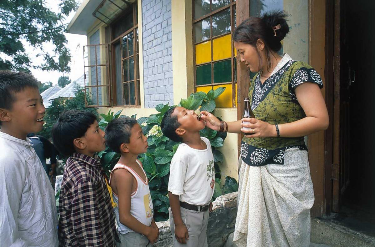 Tibetans love to drink butter tea, black tea mixed with salt and loads of butter made from yak milk. It is served in a wooden or metal bowl. It’s important to be healthy. The home mother gives vitamins to her children.