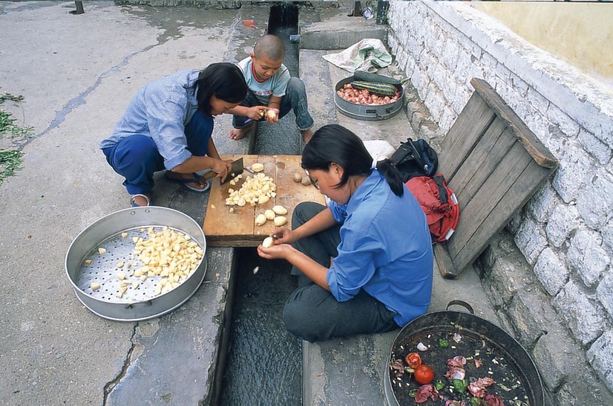 During the lunch break, all the children rush home to their family homes where they help to tidy up and serve food. All meals are cooked at home and the boys and girls help with all the housework, from fetching water to peeling potatoes, washing clothes and making the beds. Just as they would have done at home in Tibet. If the weather is beautiful the children love to eat outside. The older children take care of the younger ones and help serve.