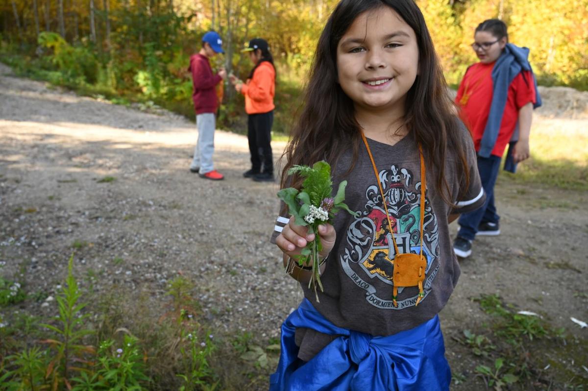 Indigenous children from the Anishinaabe First Nation in Canada on a nature walk with elders, learning about medicinal plants that need protection.