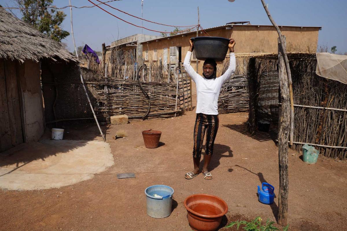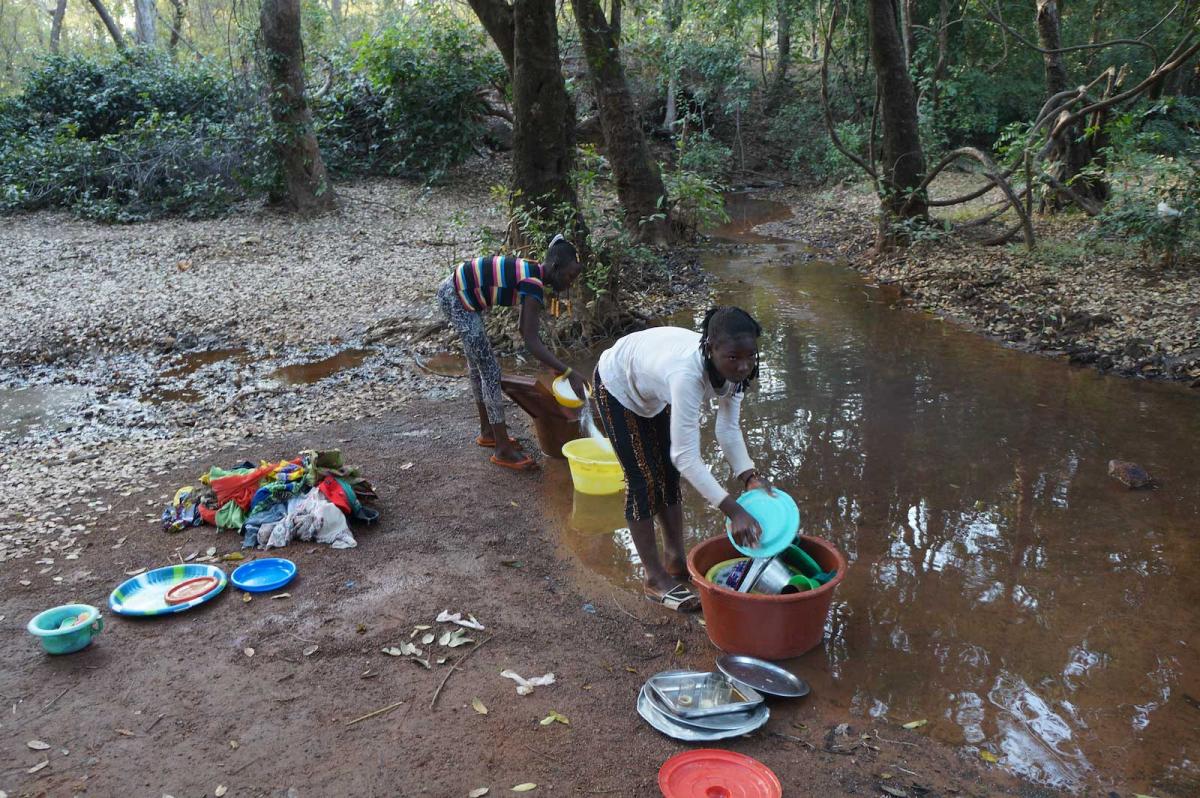 Djiba and her friend Diouma are at the river doing the dishes and washing clothes.