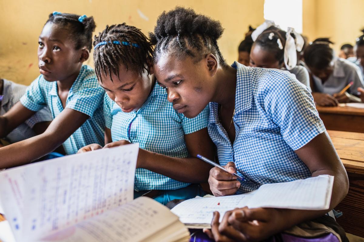 Girls in Haiti support each other in the classroom.