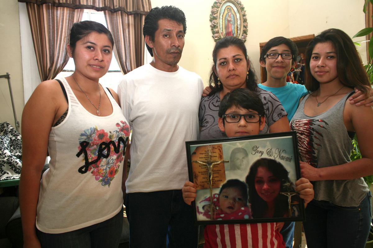 Itzel, far right, and her family with a photo of Zuri and the baby. © Joseph Rodriguez/WCPF