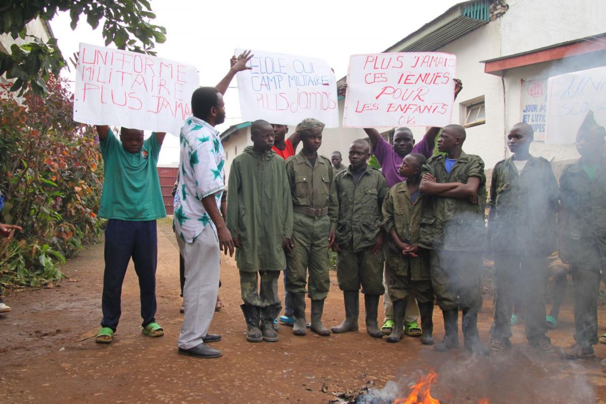 Child soldiers in DRC burn their unforms. Learn more about